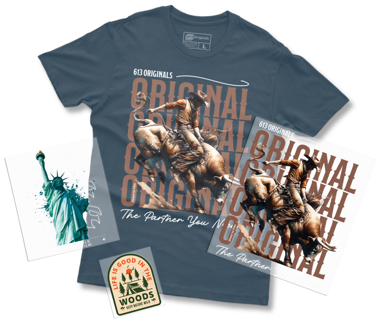 DTF single image transfers offer a durable, vibrant, and versatile solution engineered for a wide range of substrates—from apparel to hard goods. Choose from 5 single image sizes. Single image transfers are ready to press. No cutting required.