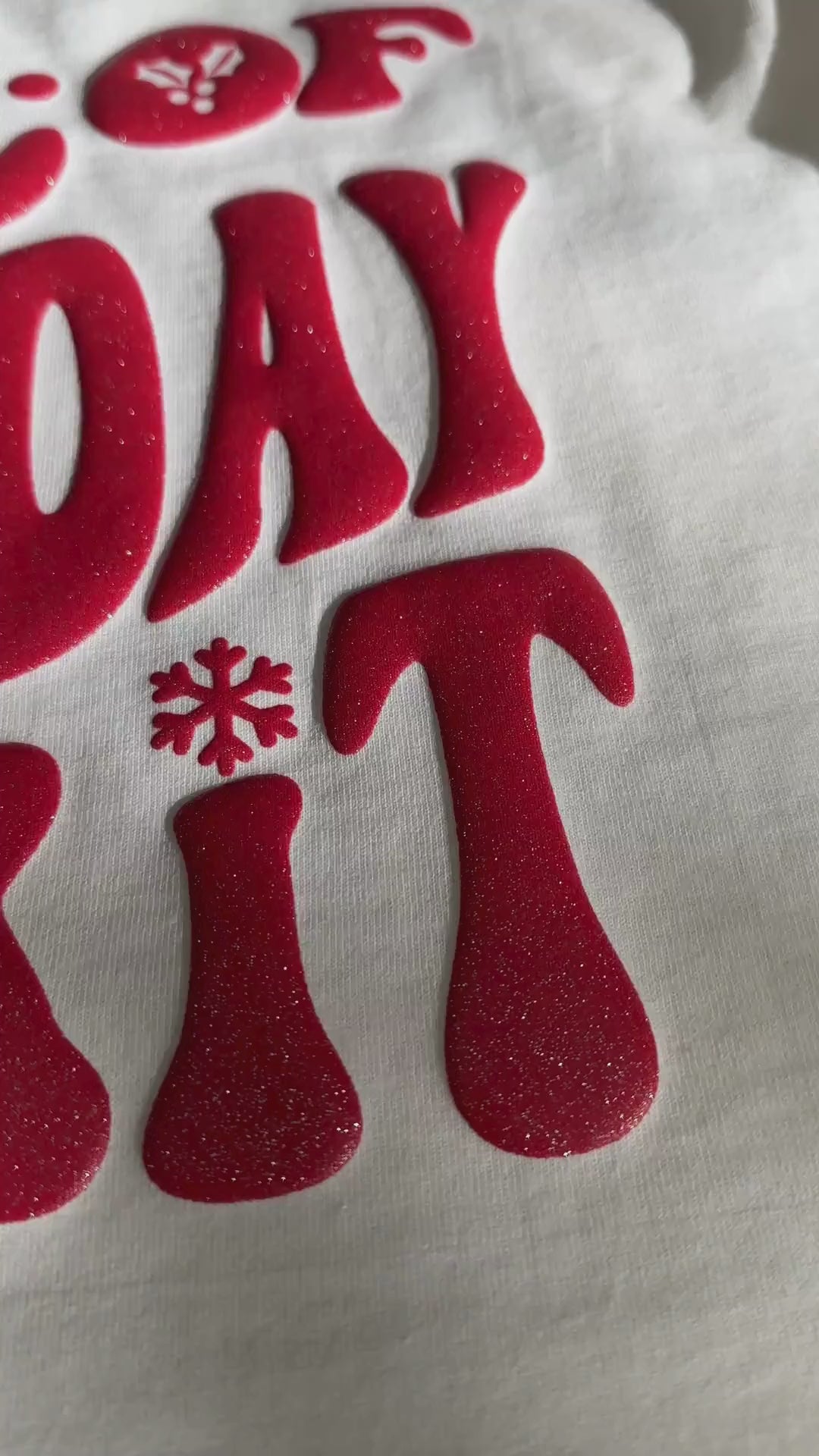 Turn up the festive energy with this vibrant red Glitter Puff design. The groovy lettering rises off the fabric with a soft, dimensional feel and an eye-catching shimmer that instantly reads “holiday mood activated.” Screen-printed for clean edges and a bold puff effect, it’s a fan-favorite for parties, markets, and merry makers everywhere.