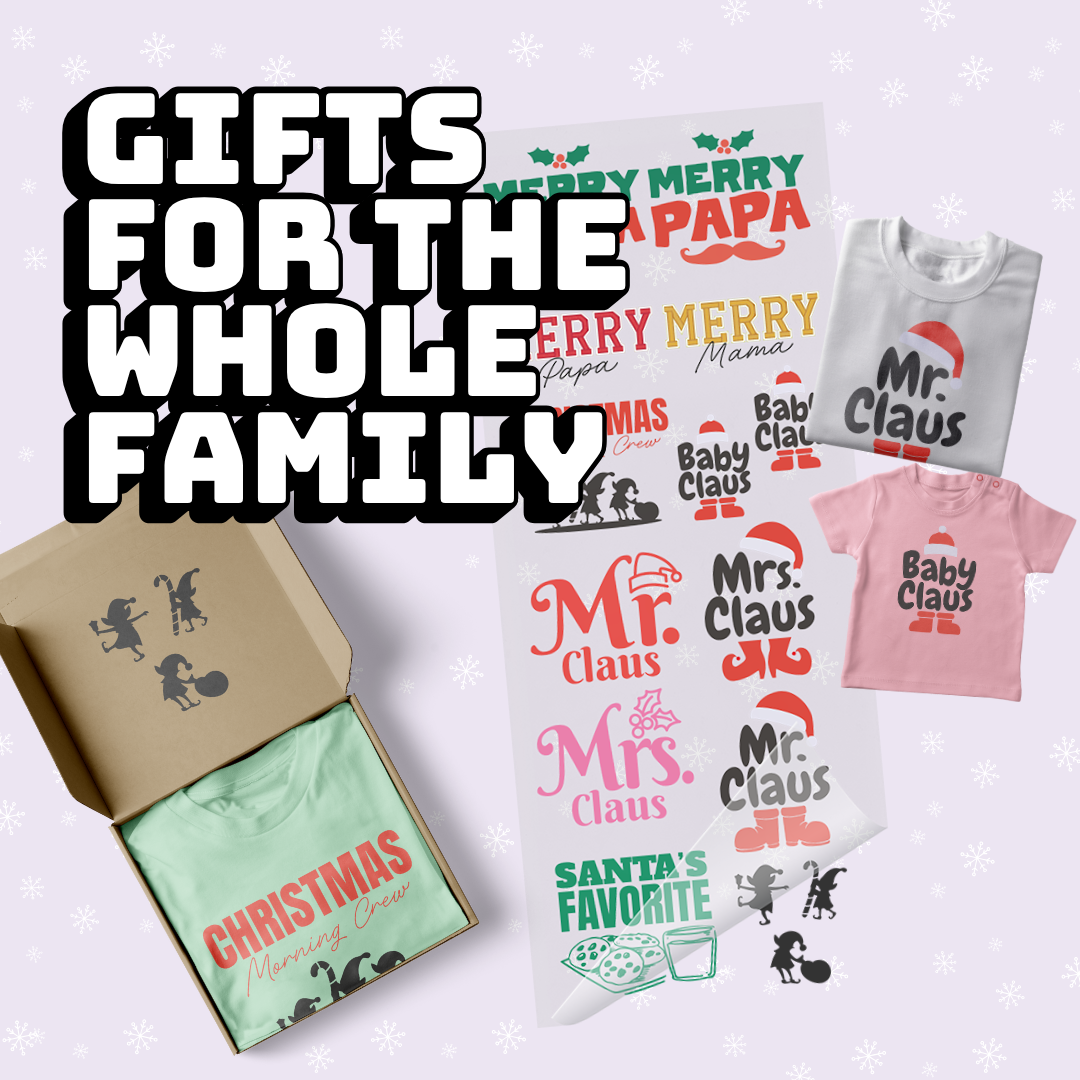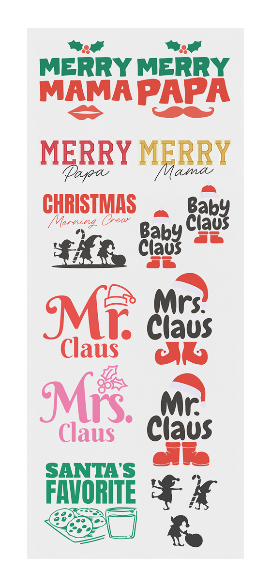 The Family Holiday Sheet is made for matching sets and family fun — featuring “Mr. & Mrs. Claus,” “Christmas Morning Crew,” “Mama & Papa Claus,” and “Santa’s Favorite” designs. Each graphic is cute, coordinated, and press-ready for cozy holiday collections.